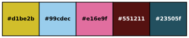 The functionality of the package is mostly concentrated in the Qualpal class, which uses a builder-type interface to customize palette generation. Here’s an example, where we construct a five-color palette from part of the hue-saturation-lightness (HSL) color space as input.