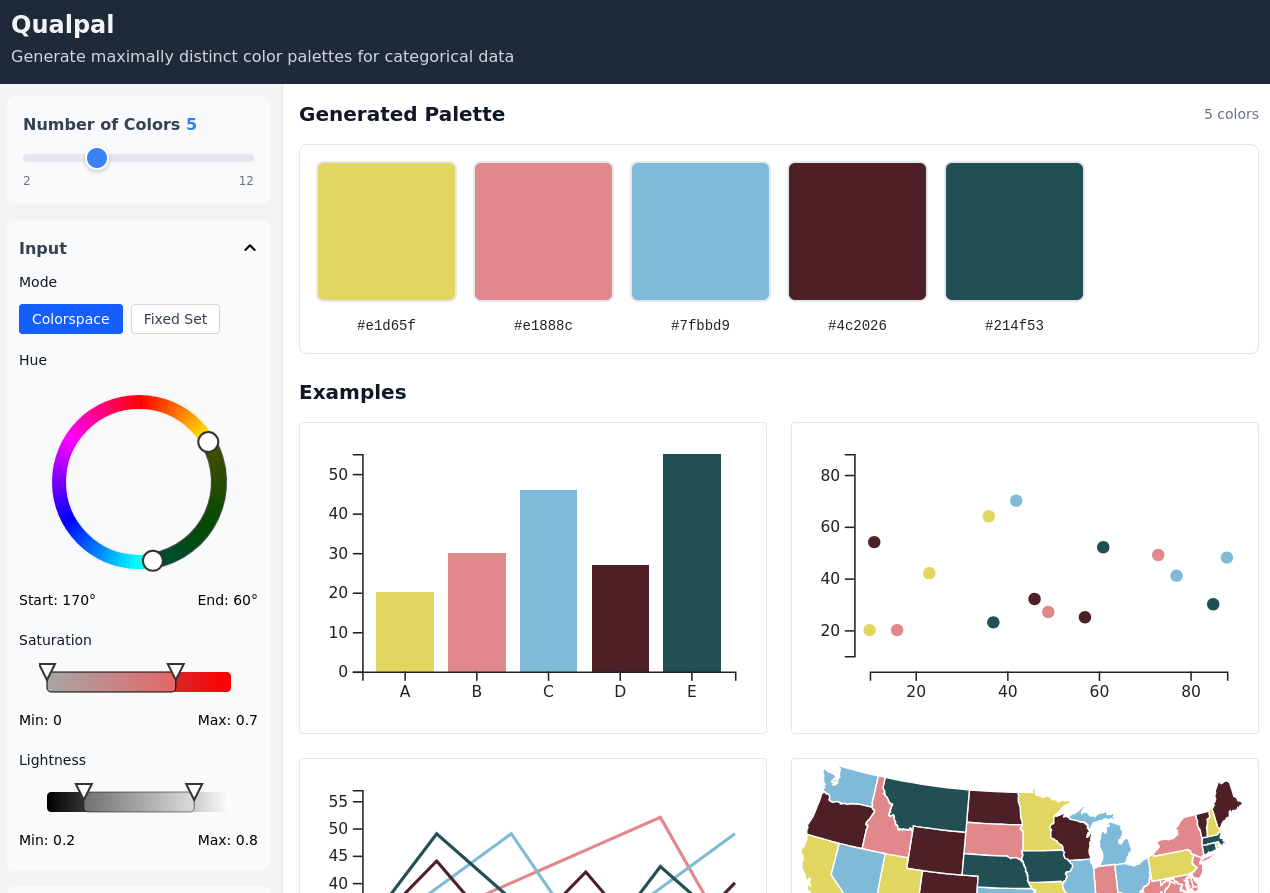 It is now nine years since I first blogged about my pet project Qualpal (at that point called qualpalr), which is an R package for generating qualitative color palettes for data visualization in R. It was motivated by the fact that almost all color palettes were designed for a fixed number of categories and therefore must be suboptimal for other numbers of categories.