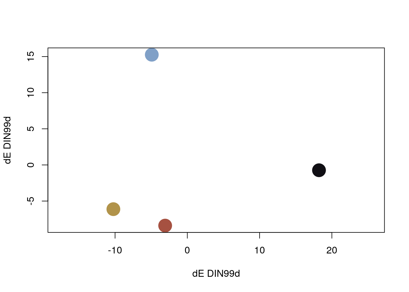 The default plot method shows a multi-dimensional scaling (MDS) plot of the colors in the color difference metric space, which gives an idea of how well-separated the colors are.